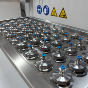 The OCS Bottle Cap Test (BCT100) is a compact solution for testing bottle caps and plastic bottles for crack resistance under combined chemical and mechanical stress in the laboratory. The system has 50 independent measuring stations, distributed across 5 measuring groups, which can be used flexibly for cap or bottle testing. The equipment includes a compressed air system, temperature-controlled wetting agent baths and a touchscreen control panel. The electronics are housed in a lockable, water-resistant control cabinet.
