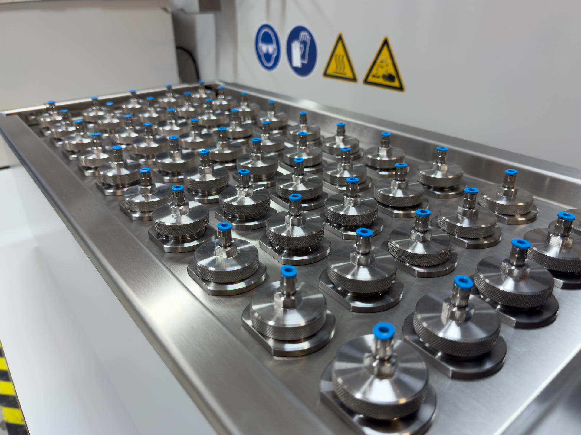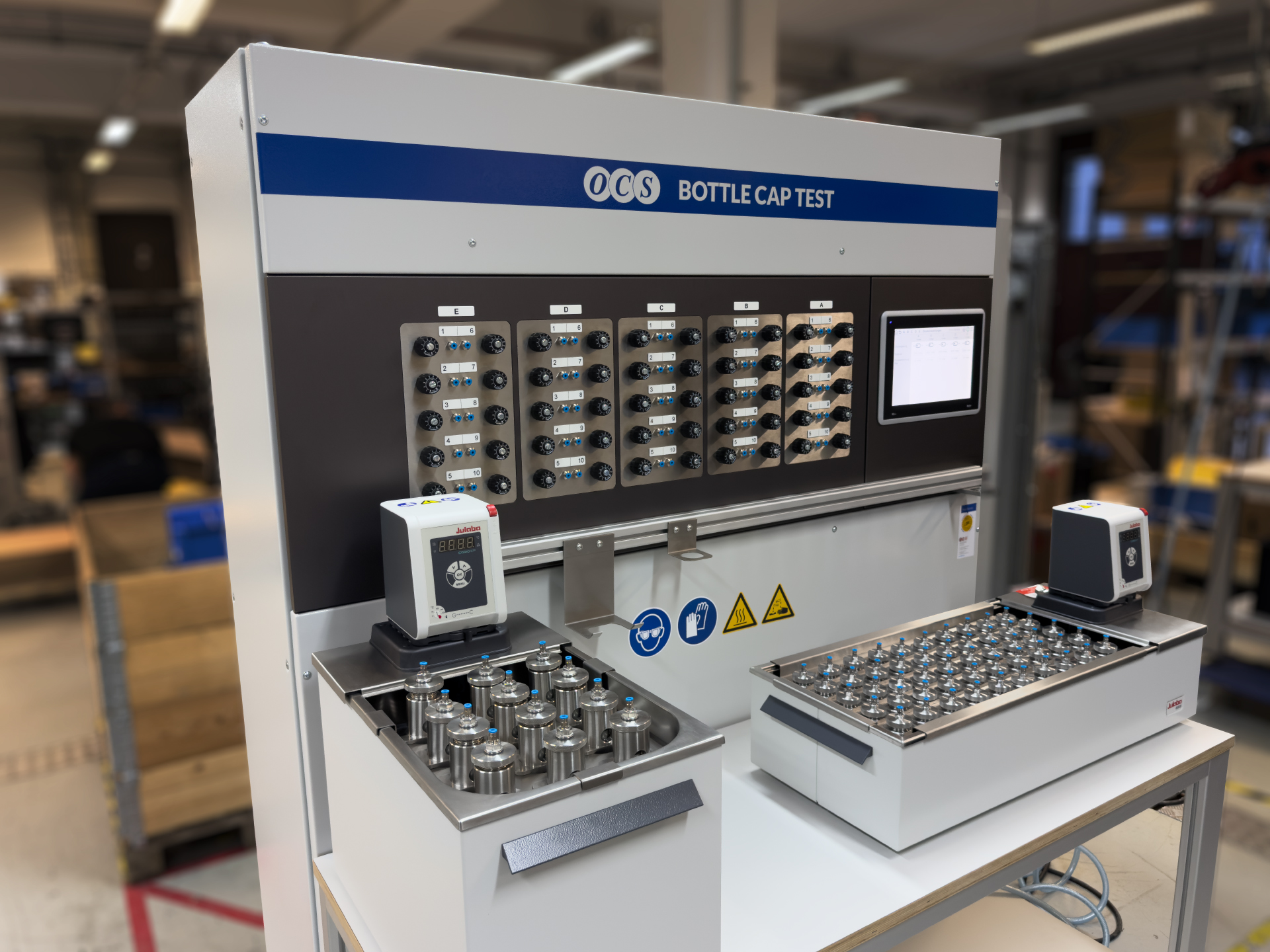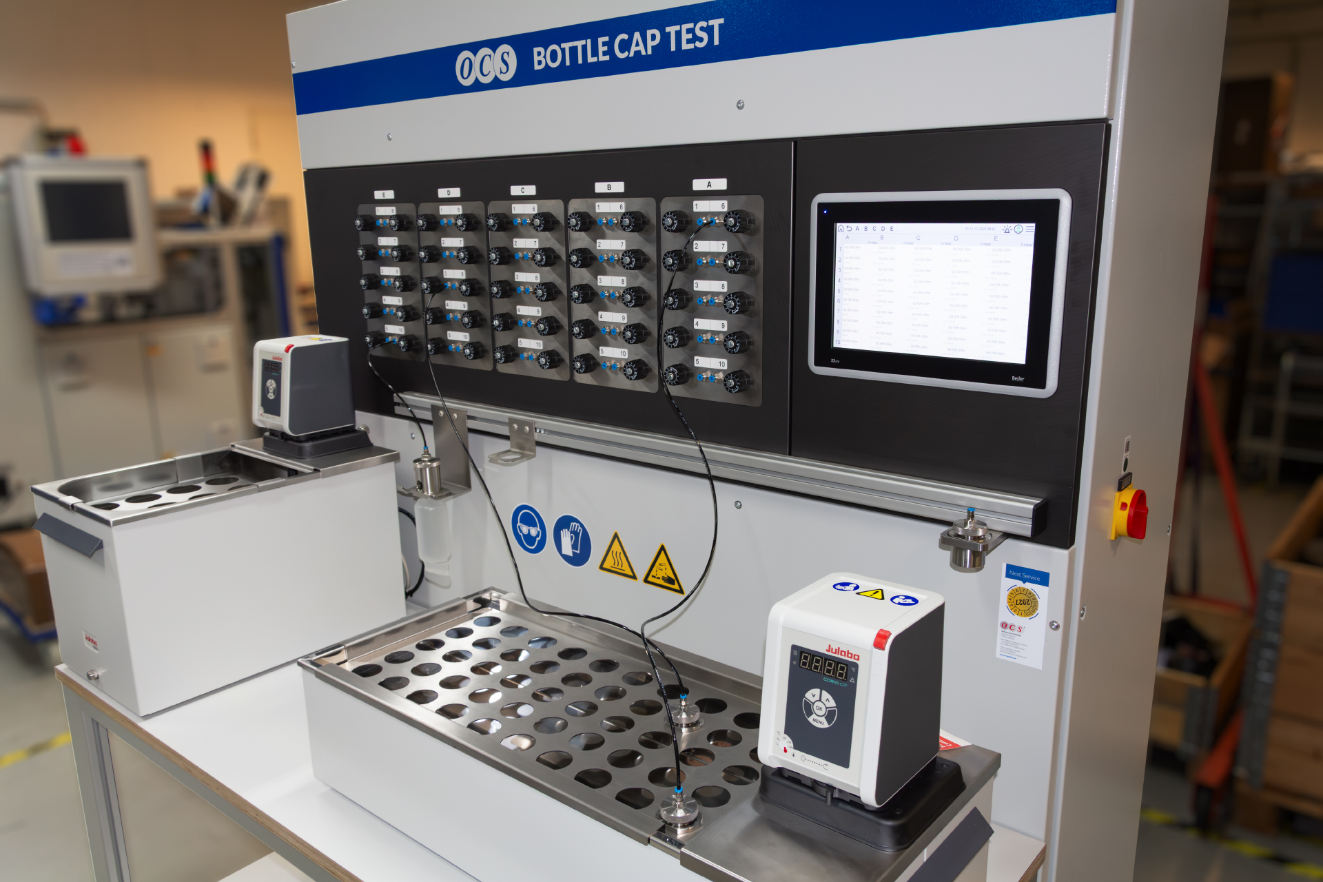 The OCS Bottle Cap Test (BCT100) is a compact solution for testing bottle caps and plastic bottles for crack resistance under combined chemical and mechanical stress in the laboratory. The system has 50 independent measuring stations, distributed across 5 measuring groups, which can be used flexibly for cap or bottle testing. The equipment includes a compressed air system, temperature-controlled wetting agent baths and a touchscreen control panel. The electronics are housed in a lockable, water-resistant control cabinet.